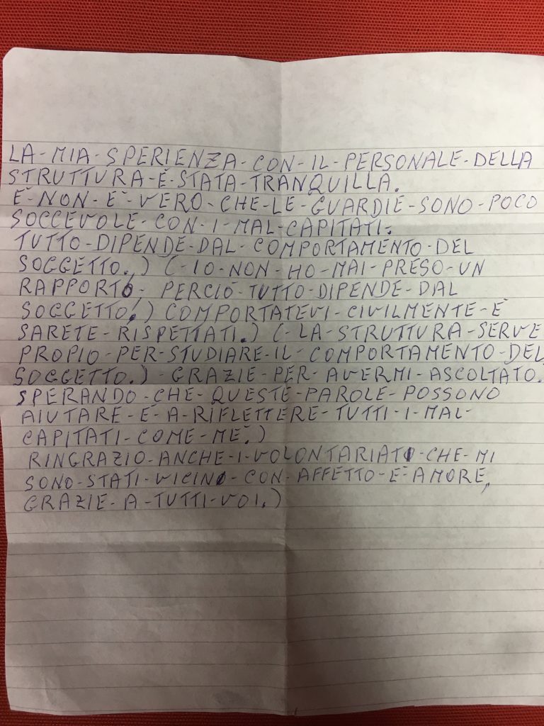 La lettera di un giovane studente ebreo deportato ad Auschwitz MILANO - Questa è una lettera che il giovane ebreo italiano Guido Bergamasco, 21, scrisse, con la speranza che un giorno arrivasse al fratello dal campo di concentramento di Auschwitz nel quale era rinchiuso. La lettera, tratta da Bookblog, è una cruda testimonianza della realtà dei campi di concentramento. lettera ad un detenuto: LETTERA AD UN DETENUTO LETTERA AD UN DETENUTO AL MIO AMICO DETENUTO Al mio caro amico detenuto,sono io l'anonimo che ti scrive,vorrei dire che hai tutta la mia solidarietà,in quanto anche io ex galeotto. Molti ci condannano, molti ci giudicano, altri ancora vorrebbero vederci morti, ma la verità e che nessuno può scegliere la vita di un altro. Come scrivere una lettera di incoraggiamento per una ... • Indirizzare correttamente la lettera così arriva alla struttura appropriata e diventa nelle mani del prigioniero. Scrivere chiaramente il nome del detenuto, qualsiasi numero di identificazione e l'indirizzo del carcere. Chiamare il carcere prima e chiedere questa informazione così la lettera di non essere in ritardo. Lettera a un detenuto Lettera a un detenuto. Foto scatta a Roma (Tor Pignattara), l'opera è dello street artist Jef Aerosol. Caro Michele, in questo momento ti sto pensando. Mentre guardo fuori dalla finestra le cose che accadono, penso che tu questa realtà non la stai vivendo, che ti è stata tolta per un tuo errore. Penso anche, però, che questa realtà, un ...