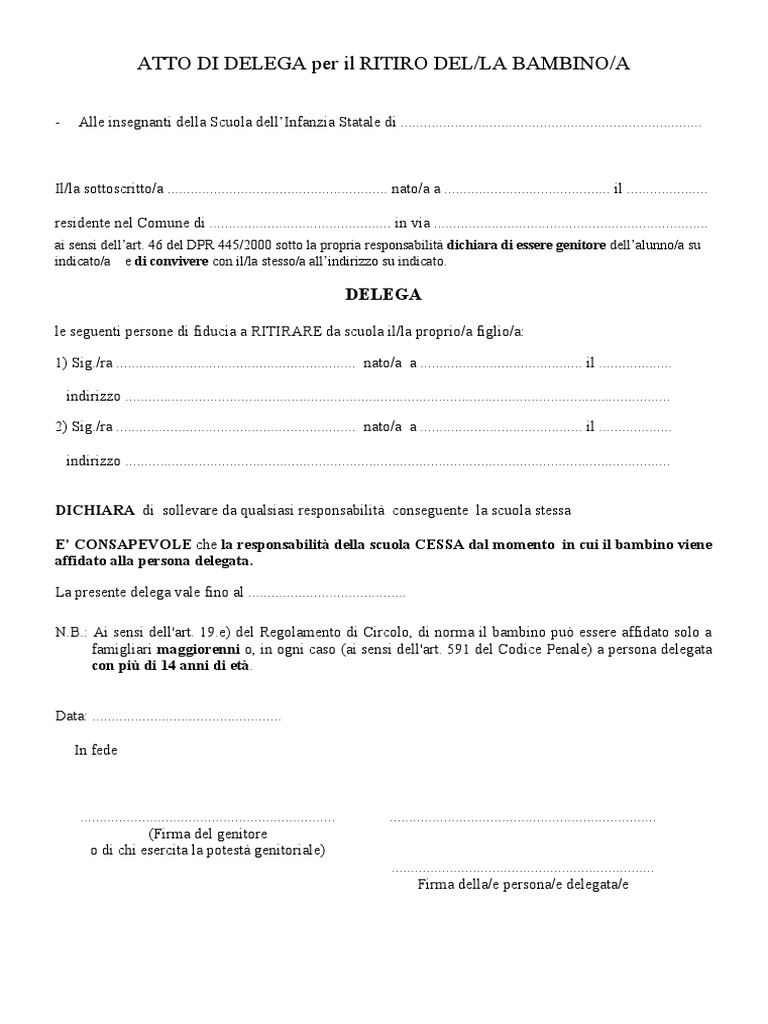 PDF Modello Di Delega Per Il Ritiro Degli Alunni Della Scuola Dell'Infanzia ... delle persone delegate, da consegnare all'ufficio della scuola. Il modulo deve essere corredato da una fotocopia dei documenti di identità della/delle persona/e delegata/e; la delega ha valore per l'anno scolastico in cui viene presentata; in caso di più bambini/e della stessa famiglia, deve essere presentata una delega per ciascuno di essi.