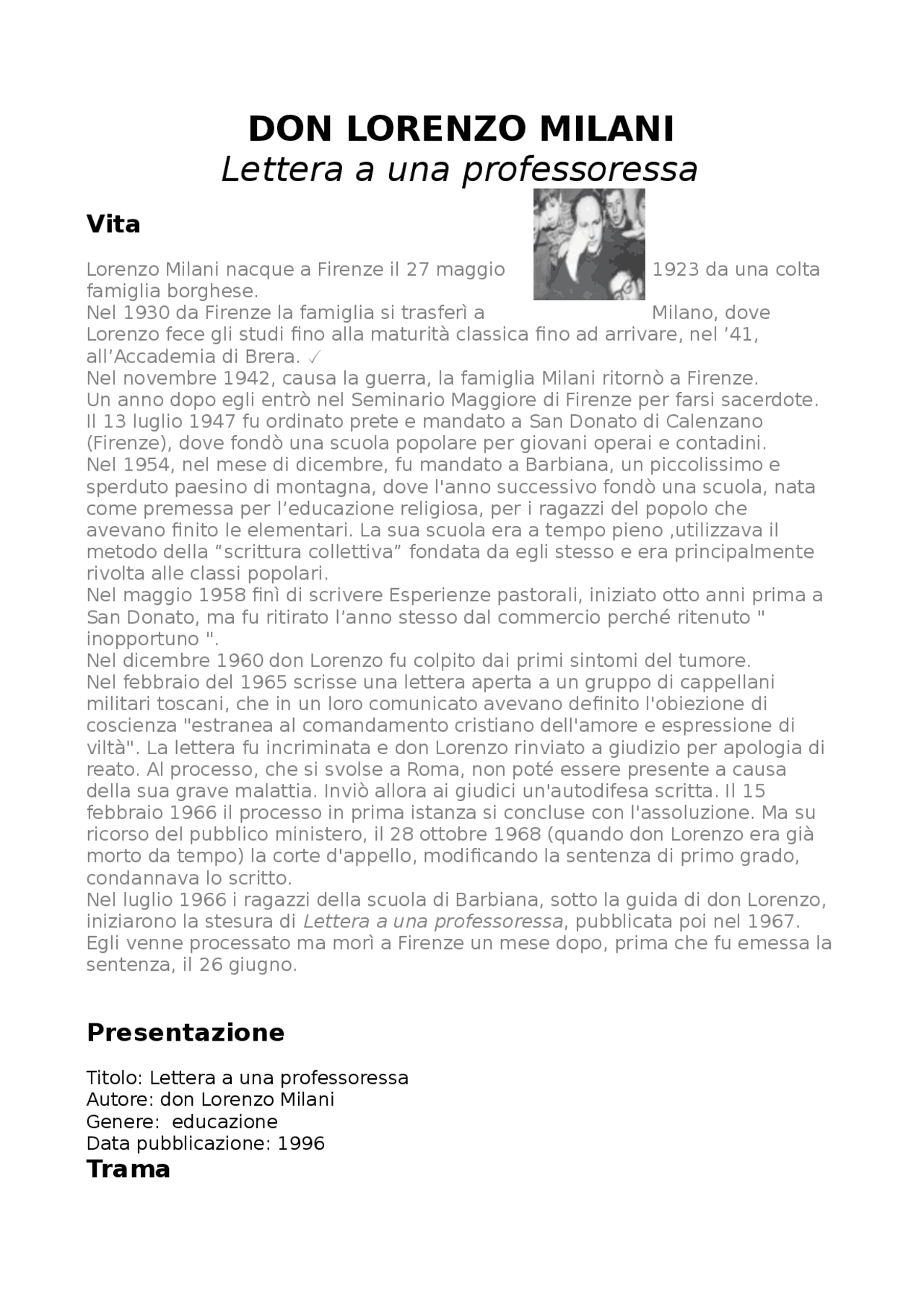 Lettera a una professoressa di Don Milani: riassunto | Studenti.it LETTERA A UNA PROFESSORESSA. Lettera a una professoressa è stato scritto da Lorenzo Milani con i suoi studenti ed è basato su una polemica all'istruzione italiana che, a quel tempo ...