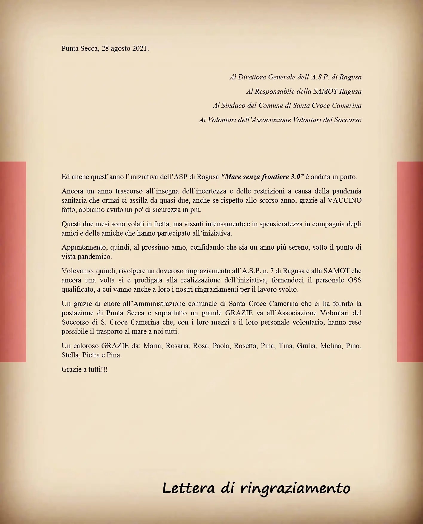 "Grazie ai dipendenti comunali per l'impegno di questi mesi" Il mio ringraziamento doveroso va a tutti quegli impiegati comunali e ai loro responsabili che in questi lunghissimi giorni di quarantena e disagio, in questo lunghissimo periodo di difficoltà oggettiva anche nel tirare avanti le più piccole operazioni che un'amministrazione comunale è tenuta ad assicurare, con assoluto spirito di collaborazione, … Lettera di ringraziamento all'Amministrazione di Pomigliano d'Arco da ... Lettera di ringraziamento all'Amministrazione di Pomigliano d'Arco da parte dell'Associazione AGVH l'Associazione AGVH ringrazia il Sindaco, l'Assessore alle Politiche Sociali e l'Amministrazione Comunale di Pomigliano d'Arco per il soggiorno marino per i diversamente abili. Scarica allegato (600 kb) Condividi Notizie e Comunicati correlati Fac Simile Lettera di Ringraziamento per Donazione - Moduli Editabili Il modulo lettera di ringraziamento per donazione compilabile messo a disposizione è in formato DOC, può quindi essere aperto e compilato utilizzando Word o un altro programma che supporta questo formato. La compilazione è molto semplice, basta infatti inserire i dati mancanti negli spazi presenti nel documento. Appuntamento con la Giornata del ringraziamento a Comonte e con la ... La federazione provinciale Coldiretti, con il patrocinio dell'Amministrazione comunale, ha organizzato la Giornata del ringraziamento, arrivata ormai alla sua 72esima edizione. A fare da ponte di unione tra iniziativa e comune è stato l'agricoltore di Comonte Lorenzo Magoni. Comonte, frazione dalla vocazione agricola