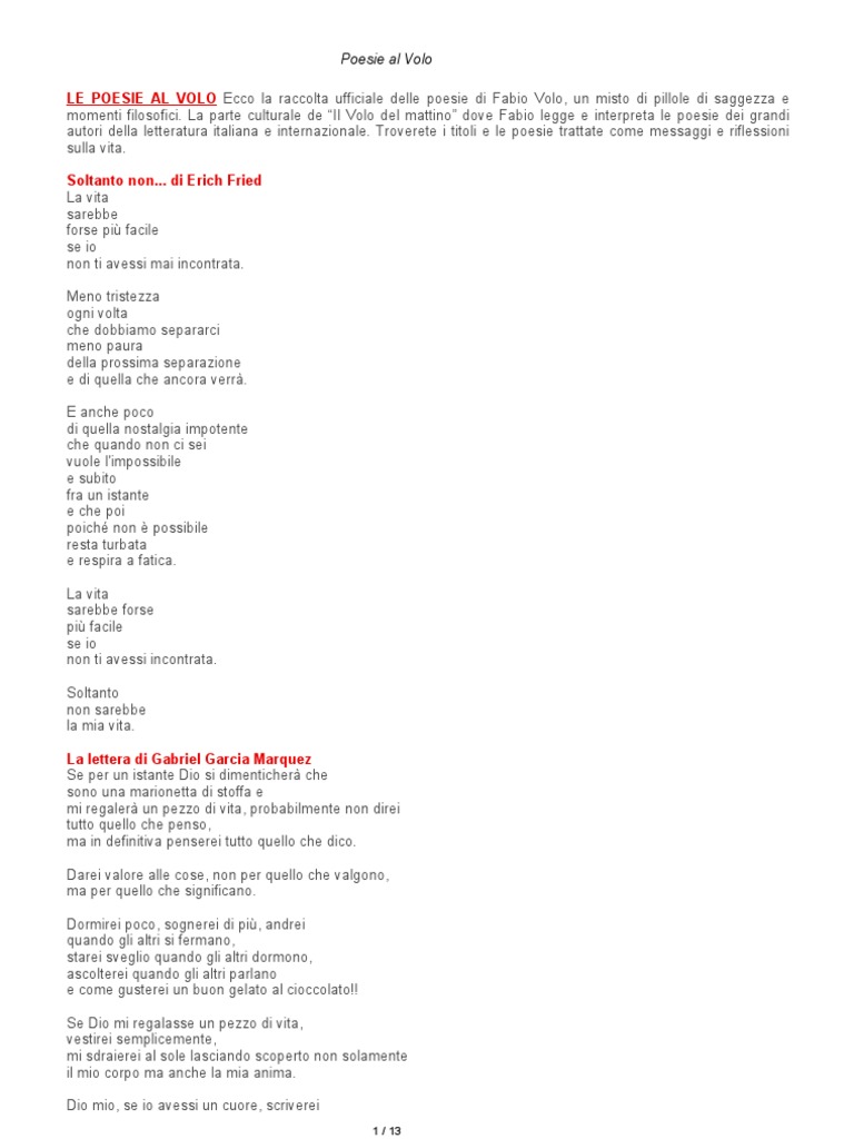 Chi è il padre di Fabio Volo? come è morto? lettera ... Apr 3, 2021 · Fabio Volo ha raccontato: “mio padre ha sempre avuto problemi economici, pignoramenti, banche. Ho visto gente entrare in casa e prendersi le nostre cose, pure il salvadanaio per riparare ai debiti di mio padre. Ho visto le umiliazioni, ho visto mio padre piangere. Il Volo del Mattino | Lettera di un padre anziano al figlio ... Mar 19, 2020 · Lettera di un padre anziano al figlio. ... Fabio Volo ha raccontato di quando, a 20 anni, perse la testa per una ragazza che lavorava come cubista in una locale a Milano Marittima.