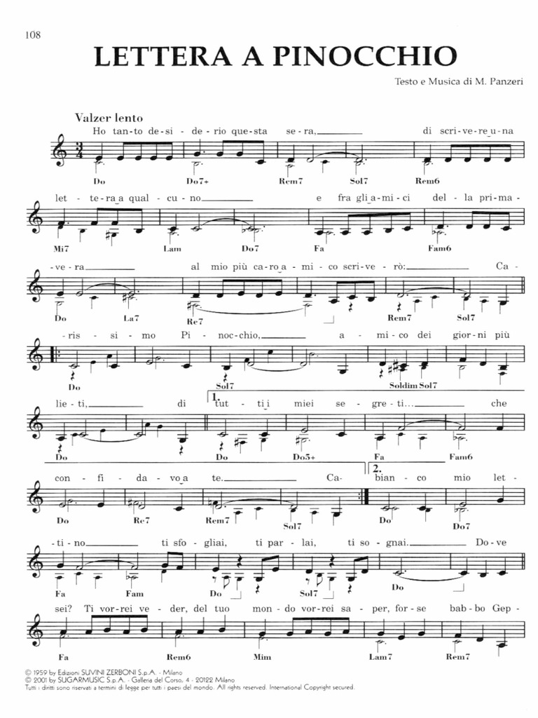 Lettera a Pinocchio - Lettera a Pinocchio - abcdef.wiki " Lettera a Pinocchio" é uma canção italiana de 1959 composta por Mario Panzeri. A canção estreou na primeira edição do festival de canções infantis Zecchino d'Oro.Apesar de não ter vencido o concurso, a canção obteve grande sucesso comercial graças à versão gravada por Johnny Dorelli, na altura muito popular graças aos dois Sanremo Music Festival que acabava de ganhar em casal ... Lettera a pinocchio - Johnny Dorelli - YouTube M.Panzeri 1961 LETTRA A PINOCCHIO CHORDS by Johnny Dorelli - Ultimate Guitar G Em F#m D E7 A7 Ohhohhhohhh (Coro) D A A7 D Carissimo Pinocchio amico dei giorni più lieti G Gm D E7 A A7 di tutti i miei segreti che confidavo a te. D A A7 D Carissimo Pinocchio ricordi q ... by Johnny Dorelli. 874 views, added to favorites 30 times. Difficulty: intermediate: Tuning: E A D G B E: Capo: no capo: Author nightswimmer [pro] 42 ...