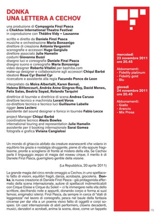 LuganoInScena - Programma - Donka - Una lettera a Cechov Donka - Una lettera a Cechov scritto e diretto da Daniele Finzi Pasca. Teatro Compagnia Finzi Pasca. Un teatro fatto di fragili equilibri, sovrapposizione di immagini, musica dal vivo, acrobazia e danza rende omaggio ad Anton Cechov e alla magia delle sue parole. ... "Donka", in russo, è un piccolo sonaglio che si appende alla canna da ... Donka, lettera a Cechov nel circo del - Donka è il nome dei ... Donka, lettera a Cechov nel circo del teatro di Paolo Bignamini. Donka è il nome dei campanellini che, nell'Ottocento, venivano attaccati alle canne utilizzate per la pesca nei fondali più profondi. ... Donka - Una lettera a Cechov scritto e diretto da Daniele Finzi Pasca Teatro Sunil e Cekhov International Theatre Festival di Mosca AL ... CENTRO GRAVITAZIONALE | Coldcut - Autumn Leaves Martedì 12 e… | Flickr Coldcut - Autumn Leaves Martedì 12 e Mercoledì 13 Aprile 2011 PRIMA NAZIONALE DONKA_UNA LETTERA A CECHOV scritto e diretto da Daniele Finzi Pasca Chekhov International Theatre Festival di Mosca, Theatre de Vidy, Lausanne e Inlevitas Productions, Finzi Pasca & Hamelin Company Donka - a letter to Chekhov - Home - Facebook Donka - a letter to Chekhov. 28 likes. a production of: Teatro Sunil Chekhov International Theatre Festival in co-production with: Théâtre de Vidy - Lausanne Inlevitas - Finzi Pasca & Hamelin Company